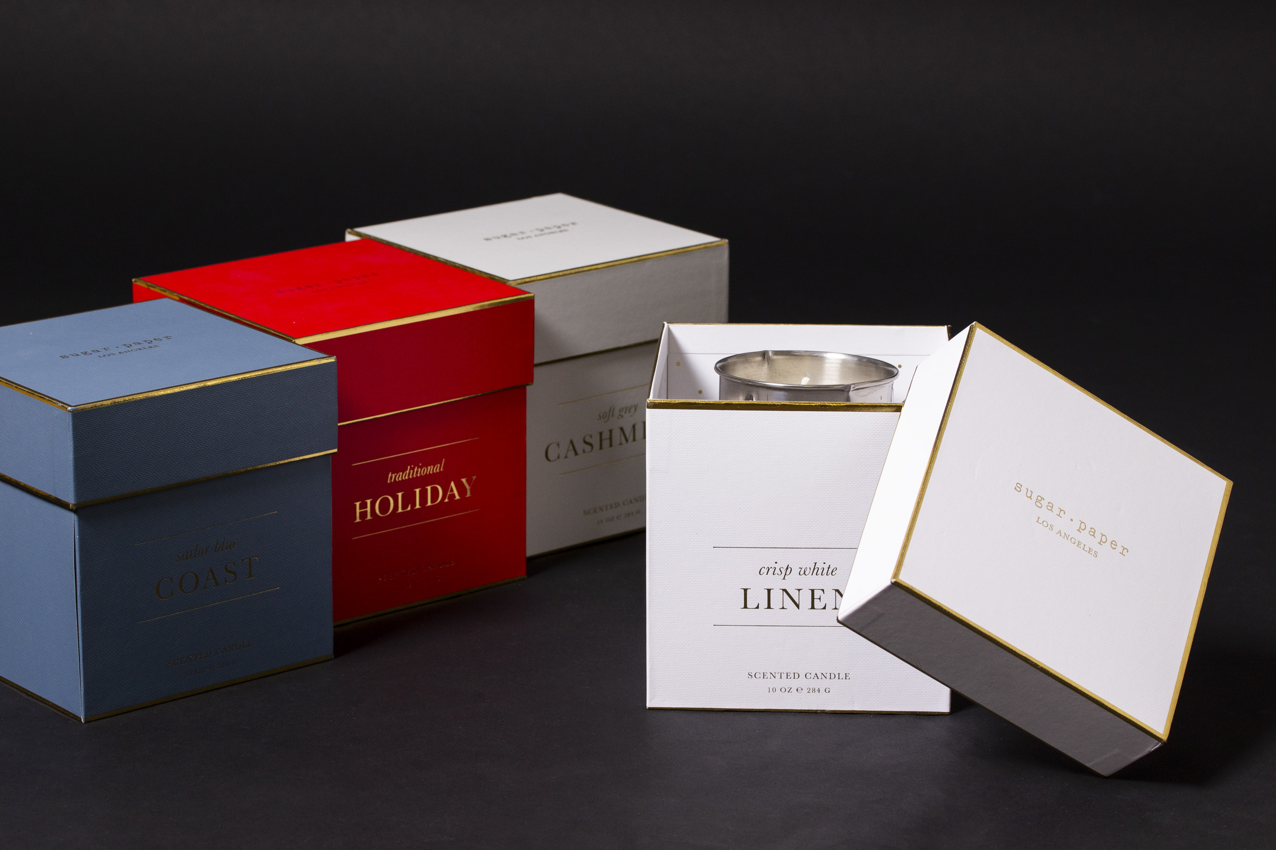This premium candle box is made with texture paper and lamination. All edges are stamped with gold foil. Each design is printed with unique Pantone color to distinguish each flavor. Interior box is foiled with polka dots. Customized insert is used to hold the candles from moving inside the box.