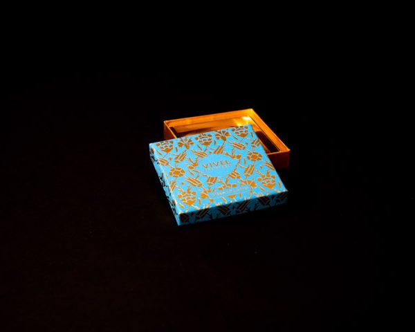 The premium chocolate box is being made with fabric material. Non-smell and non-toxic glue are being used to make this box as food grade packaging. Premium fabric material with gold foil is wrapped on the cover of box. Gold paper is wrapped for the interior of box to add the aesthetic and luxury appearance.