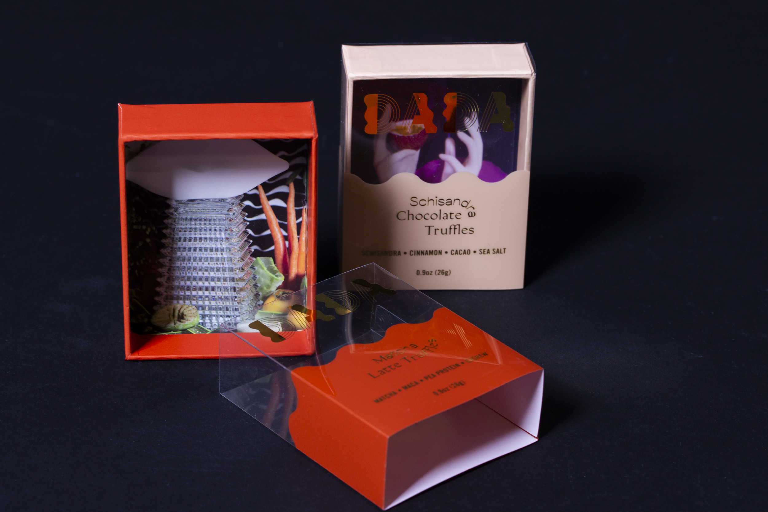 DADA premium truffle & chocolate box is made with food grade material and glue. Non-toxic glue is used to eliminate the smell. PET covers with silkscreen and gold foil printing are used for customers to see products clearly. Drawer Box style is used for easy slide off.