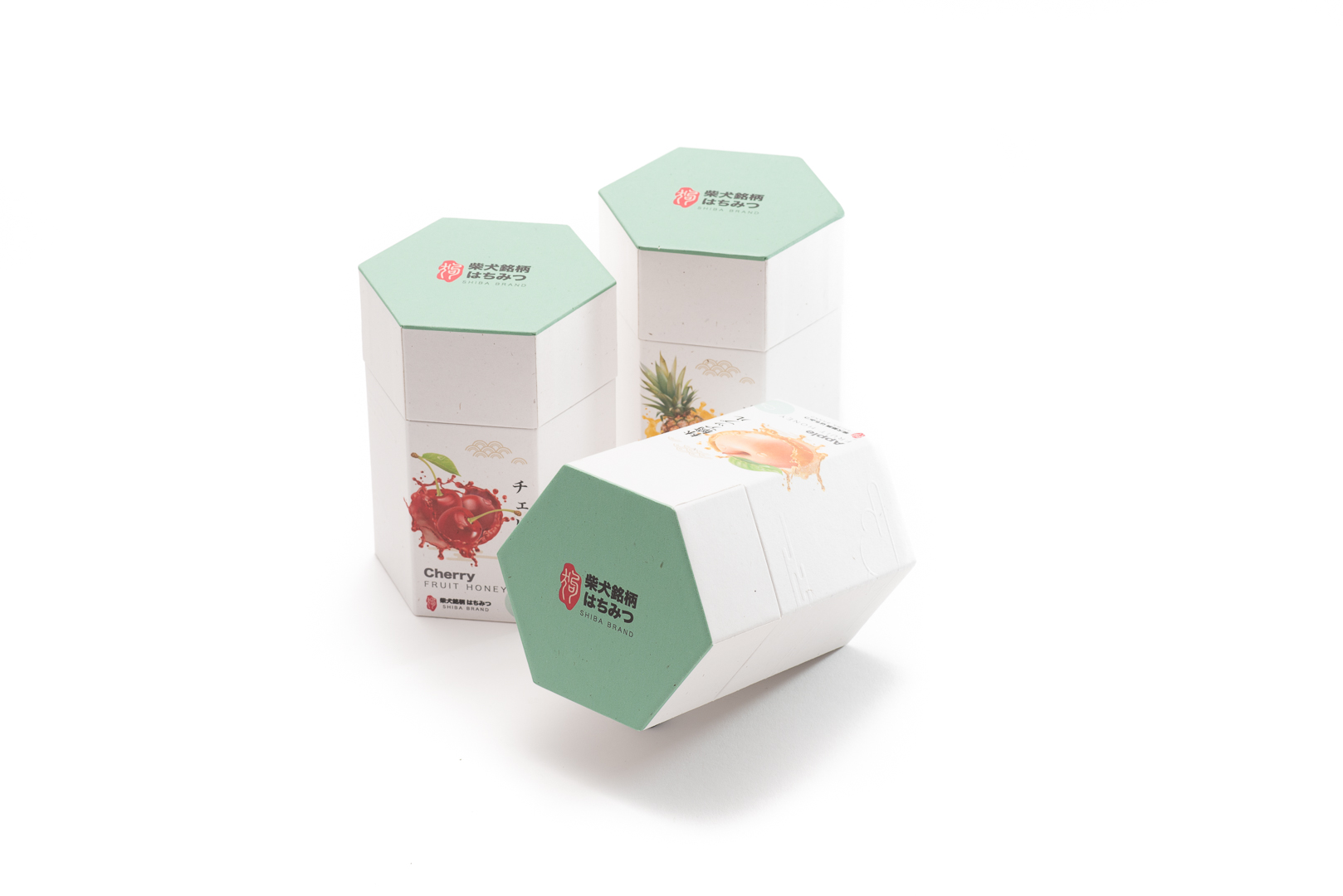 Japanese renowed honey maker uses these hexagon boxes for their honey jars. Customer wants the packaging to represent the hexagon honeycomb. The cover is wrapped with premium linen paper with embossing patterns. There are 4 different flavors for the whole set.