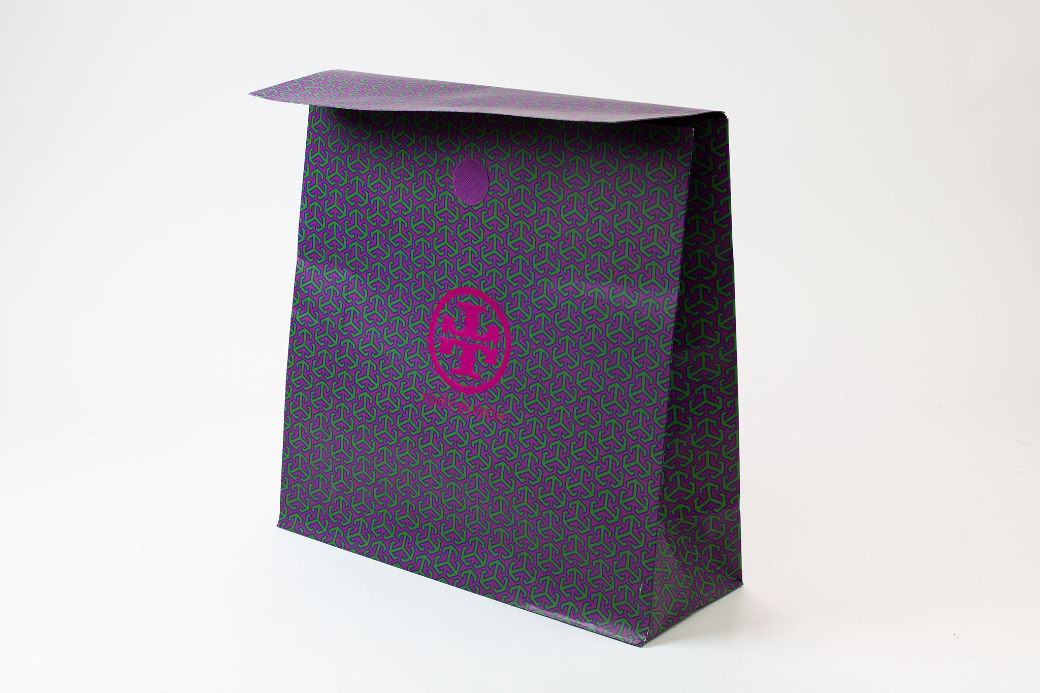 Our prestige clients utilizes their unique pattern on their shopping bags. Each bag is printed with our offset printing machine, so the colors are vibrant and prominent. Each bag has a large flap in the front with velvet button closure.