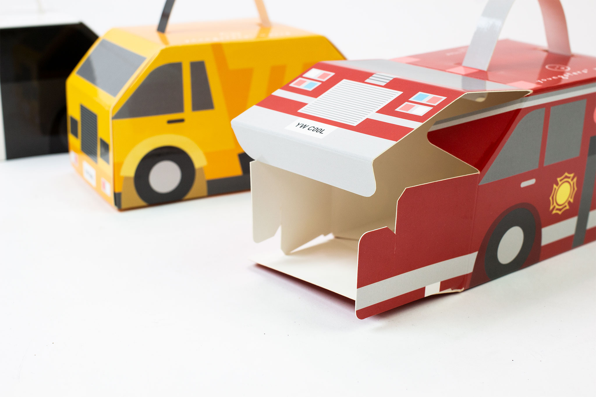 Youngsters' World is a city that runs by kids taking on various roles & responsibilities throughout the city. Kids would have the chance to purchase the cookies in various car shapes. Our designers create the diecut for each vehicle. Colors are vibrant with various diecut. Kids can enjoy cookies while they play with the boxes.